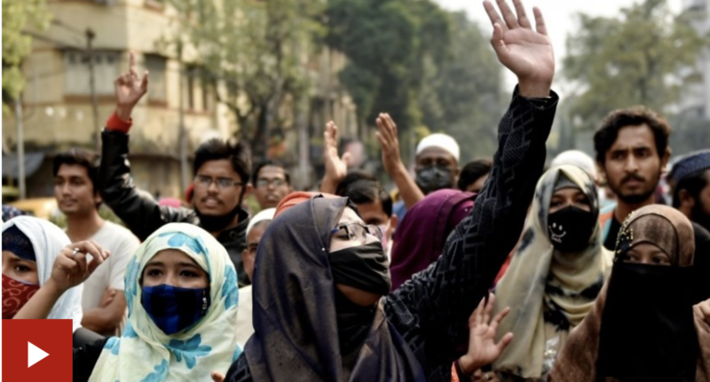 In a video that has gone viral, the 19-year-old student can be seen entering her college as a mob of men approach her. Wearing saffron shawls – a colour associated with Hinduism and Hindu nationalist groups – they started shouting “Jai Shri Ram” or “victory to Lord Ram”.