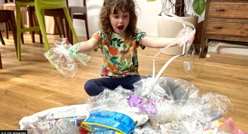 Jules Birkby, 41, and her family of four threw away 124 pieces of plastic during their week of counting. The packaging in party bags and sticker packs for her daughter Emmy’s sixth birthday was the most frustrating, she says.